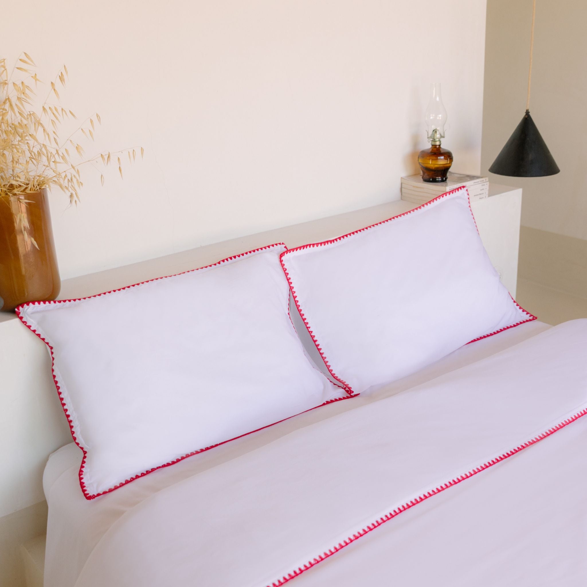Pillowcases have 2 cm flaps on all four sides, finished with a shell stitch.