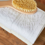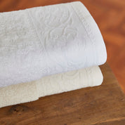 Despite not being considered "a towel", a bath mat is a fundamental part of bathroom linen, as it helps drying one's feet after stepping out of the shower and, most importantly, they will ensure that your bathroom floor will be kept dry, avoiding slipping.