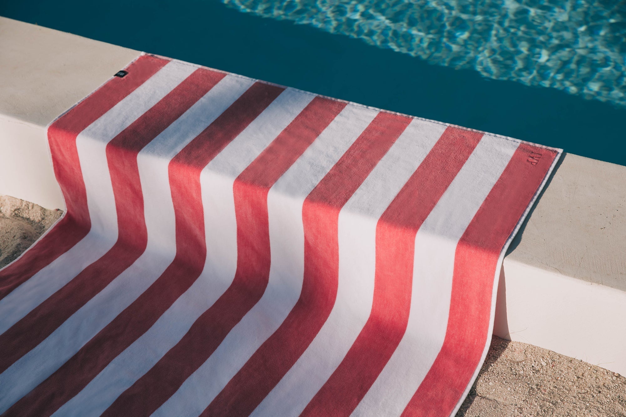 Made in velour terry and 420 GSM of cotton, the Gibalta beach towel measures a generous 100x180 cm and is available in ten color-ways: blue and white, green and white, yellow and white, grey and white, pink and white, terracotta and white, red and white, navy blue and white, beige and white & lavender and white.