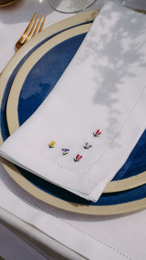 • A single flower embroidered in the centre of each napkin (4 napkins, 4 different flowers).